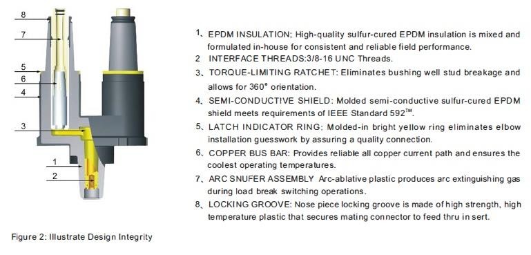 Производ је изливен од ЕПДМ изолационе и полупроводне гуме очвршћене сумпором, пружајући одличну електричну изолацију, контролу напрезања и заптивање околине. Када се користи са одговарајућим компонентама, формира потпуно заштићен и потопљени систем повезивања.